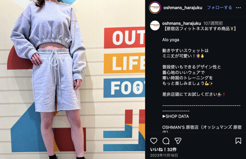 特に原宿店はトレンドのスポーツウェアを豊富に取り揃えており、aloYOGAのコーナーが設けられていることがあります。実際に生地の厚みや伸縮性を確認できるのは、実店舗ならではの大きなメリットといえるでしょう。