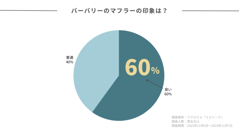 バーバリーのマフラーは時代遅れかどうか、印象調査を行ったところ、「良い」と回答している方が6割という結果になりました。「悪い」と回答している方は1人もいませんでした。