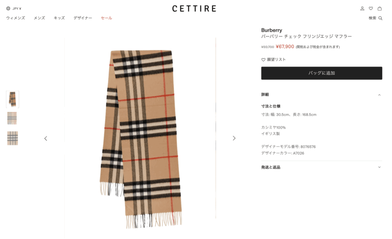 ただし、アウトレットでは定番のクラシックなカシミアマフラーよりも、シーズンオフのアイテムや、少しデザイン性のあるモデルが中心になる傾向があります。