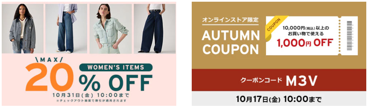 リーバイス公式サイトでは、定期的に期間限定のクーポンやキャンペーンが実施されています。代表的なものは以下の通り。
