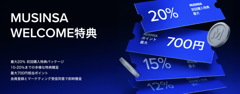 まだMUSINSAを使ったことがない方は大チャンス!新規会員登録をするだけで、すぐに使える豪華な特典セットがもらえます。