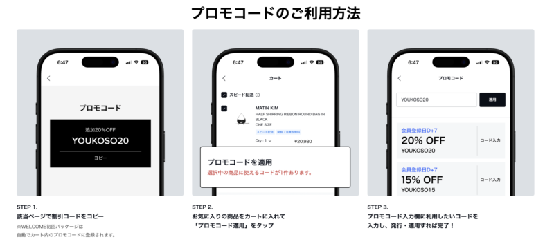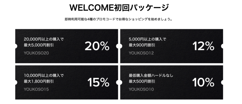 • WELCOME初回クーポンは自動でカート内のプロモコードに登録されます。