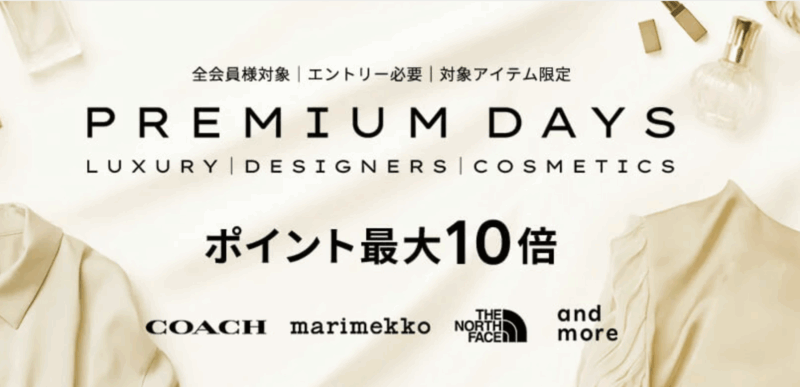 楽天市場の「PREMIUM DAYS」は、ラグジュアリー・デザイナーズ・インターナショナルハイブランドやコスメの対象商品をお得に購入できるキャンペーンです。キャンペーン期間中にエントリーし、条件を達成すると、ポイントが最大10倍まで獲得できます。