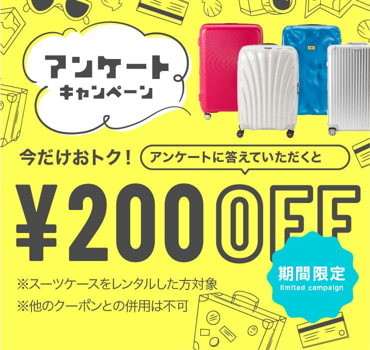 クーポンごとに「〇〇円以上のレンタルで利用可」「スーツケース本体のみ対象」など条件がある場合があります。例えばアンケート200円OFFは「旅行用品のみレンタルは対象外」でした。自分の注文内容が条件を満たしているか事前に確認しましょう。
